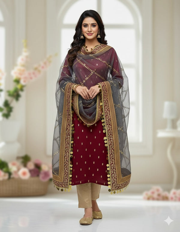 4Pc Double Border Full Heavy Embroidered Gift Pack with Shoes Free D-Grey